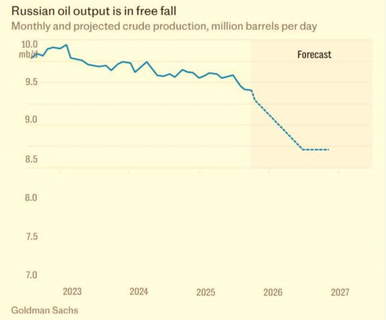 Російські нафтопереробні заводи використовують менше нафти, іноземні держави купують менше нафти, а нафтосховища руйнуються. Через це Росія виробляє менше нафти і зараз перебуває на найнижчому рівні з 2022 року.