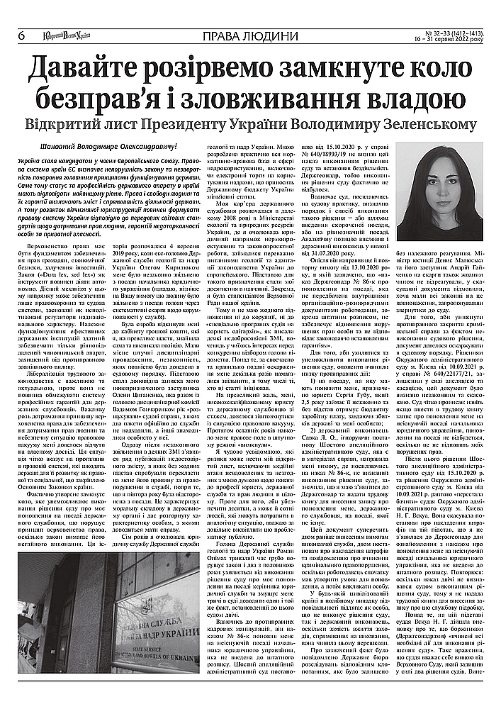 Фактично утворене замкнуте коло, яке унеможливлює виконання рішення суду про моє поновлення на посаді державного службовця, що порушує принцип верховенства права, оскільки закон вимагає його негайного виконання. Ця історія розпочалася 4 вересня 2019 року, коли екс-головою Державної служби геології та надр України Олегом Кирилюком мене було незаконно звільнено з посади начальника юридичного управління (нагадаю, пізніше на Вашу вимогу цю людину було звільнено з посади голови через систематичні скарги щодо корумпованості у службі).