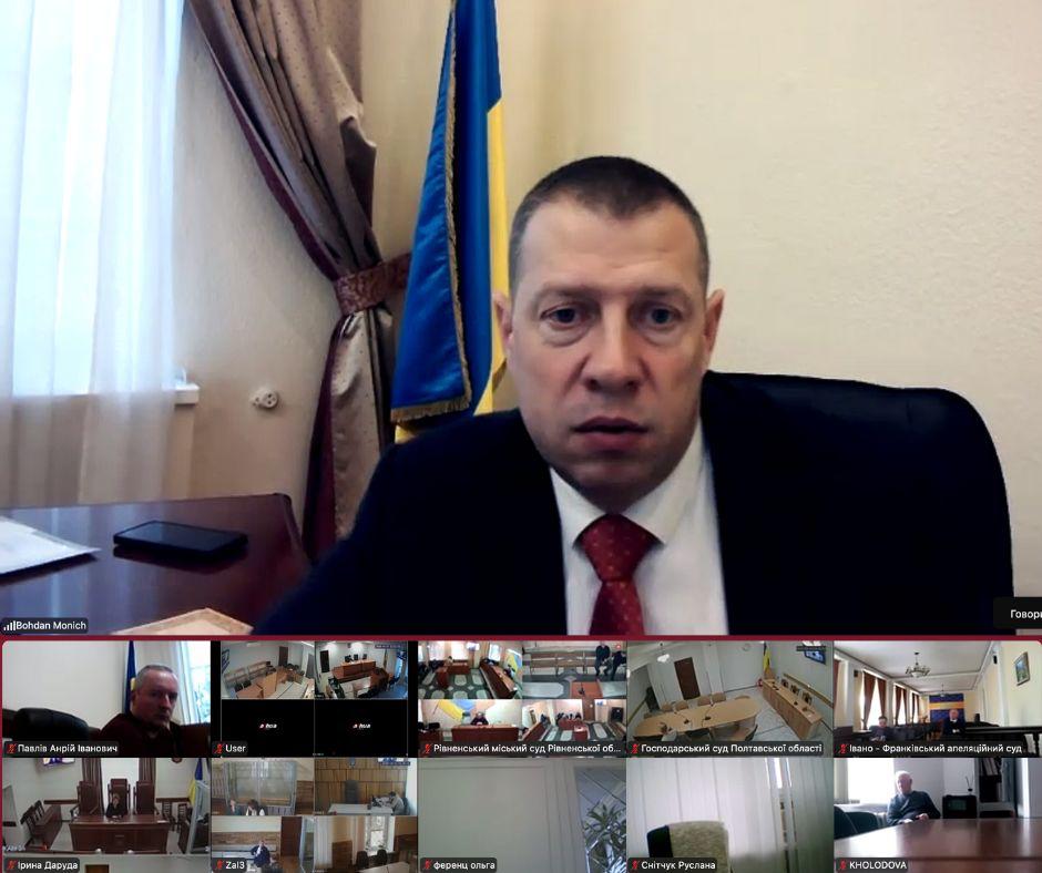 У межах свого виступу Голова Ради суддів України Богдан Моніч поінформував про діяльність РСУ, звернувши увагу на її нещодавні рішення, які стосувалися пом’якшення вимог до кандидатів на посади помічників суддів, а також оприлюднення суддівських досьє та декларацій.
