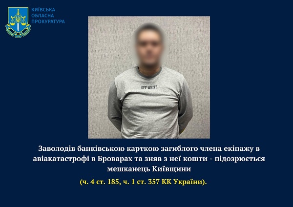 За даними слідства, у січні 2023 року після авіакатастрофи в Броварах підозрюваний прийшов на місце події. Скориставшись скупченням людей, які надавали допомогу постраждалим, він привласнив мобільний телефон і візитницю з банківською карткою одного із загиблих членів екіпажу.