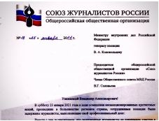 У зв’язку з тим, що одним із пріоритетних завдань Спілки Журналістів Росії є захист професійних прав журналістів, просимо Вас взяти під особистий контроль проведення перевірок за фактом затримання журналістів на предмет законності, а також за фактом застосування насильства і перешкоджання здійсненню журналістської діяльності при висвітленні несанкціонованих акцій , які пройшли 23.01.2021 року.