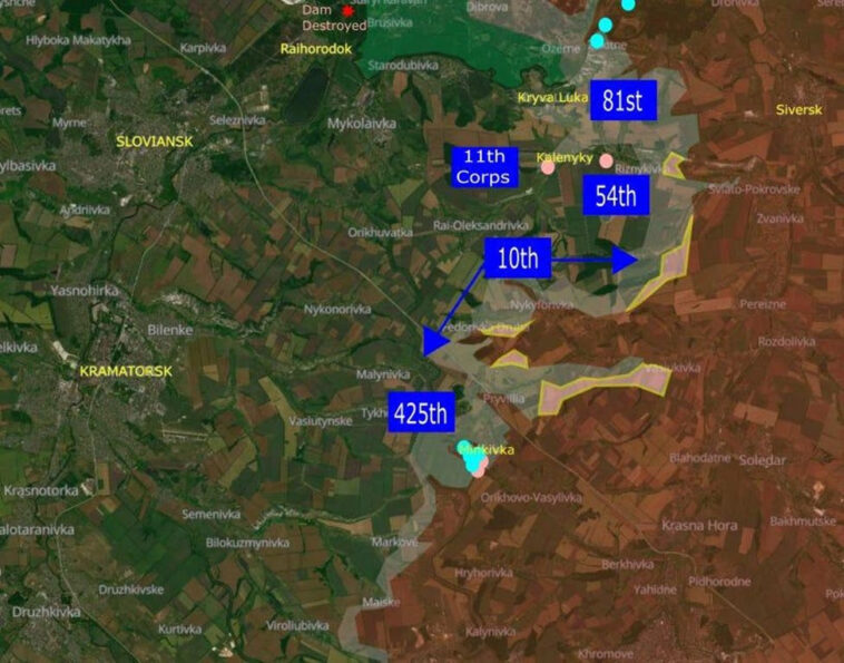425-й штурмовий полк, схоже, зупинив просування росіян з Мінківки . Лінії фронту на північ від Мінківки все ще нестабільні. Це єдина відповідальність 11-го корпусу, а єдиний стабільний сектор знаходиться на схід від Кривої Луки, яку обороняє 81-ша аеромобільна бригада, яка завдала ударів по російській техніці в Сіверську . 10-та гірська бригада — дуже велика бригада, яка відповідає за більший оборонний фронт. На захід від Калеників росіяни очищають бункер.