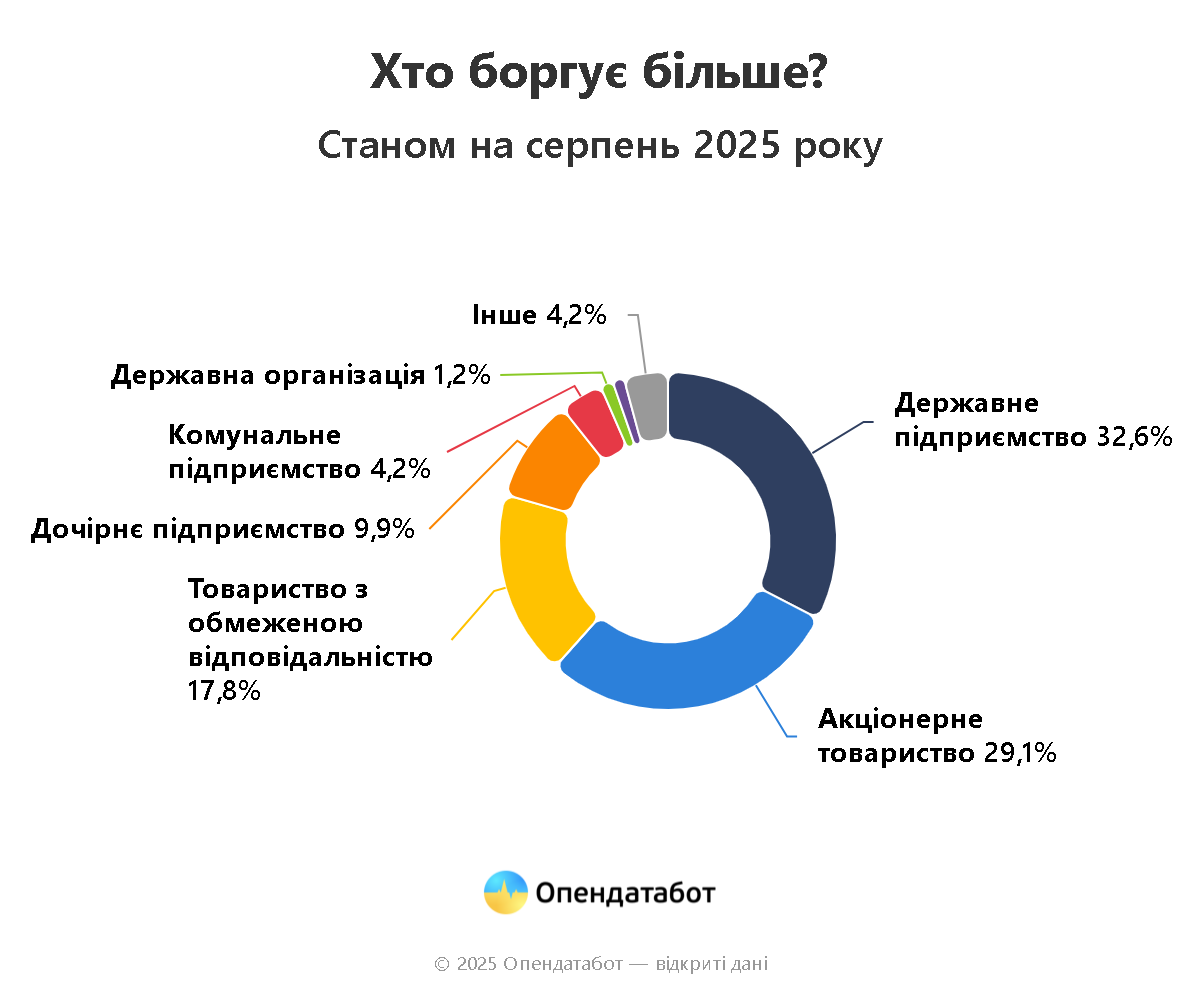 В “Опендатабот” зауважують, що найчастіше боржниками є державні підприємства — 11 562 (33%), акціонерні товариства — 10 308 (29%) та товариства з обмеженою відповідальністю — 6 298 (18%).