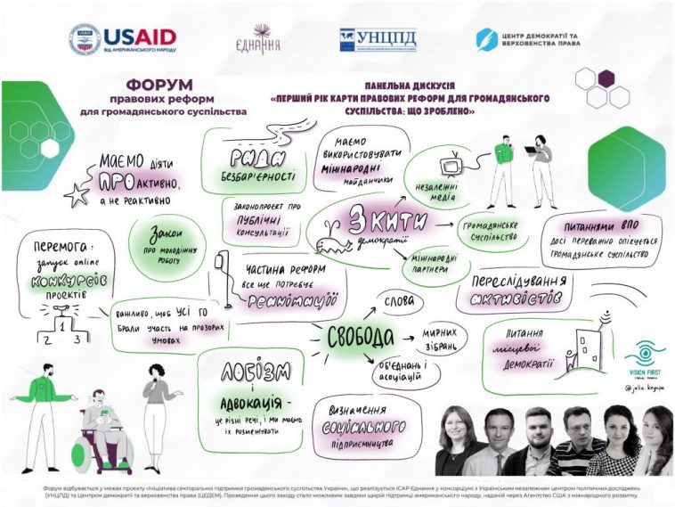 Протягом першого дня події під час панельних дискусій учасники обговорили прогрес та виклики втілення в законодавстві України положень Карти правових реформ для громадянського суспільства: небезпеки для третього сектору, Національну стратегію сприяння розвитку громадянського суспільства, Національну стратегію зі створення безбар’єрного простору в Україні як виклики чи можливості для правових реформ для громадянського суспільства.
