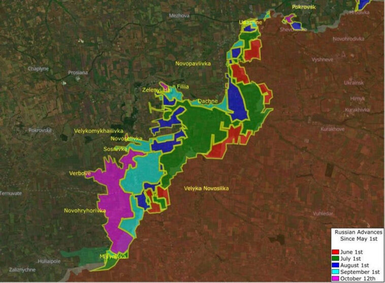 За 4 1/2 місяці Росія просунулася на цій ділянці на 22 км. Оскільки просування росіян на Покровському напрямку зупинилося лише на 13 км за той самий період. Є повідомлення про те, що російські війська перекидаються з Покровська до Великомихайлівки, щоб спробувати зберегти там свій темп.